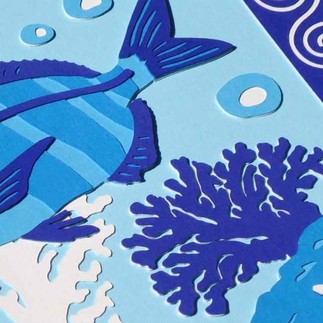 Take to the open sea, go down into the depths of the sea with this unique cut-out paper collage. A travel with Greek inspirations that makes paper art and graphic design meet together. Get relax with the bubbles noise. You just have to present it in a nice frame. These cut out paper pictures quiet your mind and bring a mediterranean touch to your interior.