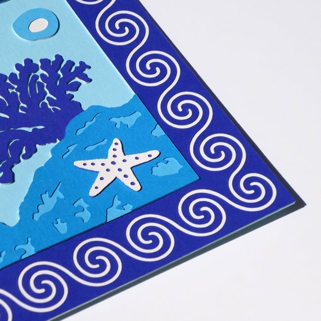 Prenez le large, descendez dans les profondeurs et déconnectez-vous du quotidien, avec ce collage en papier découpé unique. C’est un voyage vers des inspirations grecques pour une décoration qui réunit art du papier et graphisme. Laissez-vous bercer par le bruit des bulles ! Agrémentée d’un joli cadre, cette illustration en papier haut de gamme calme les esprits agités tout en apportant une touche méditerranéenne à votre intérieur.
